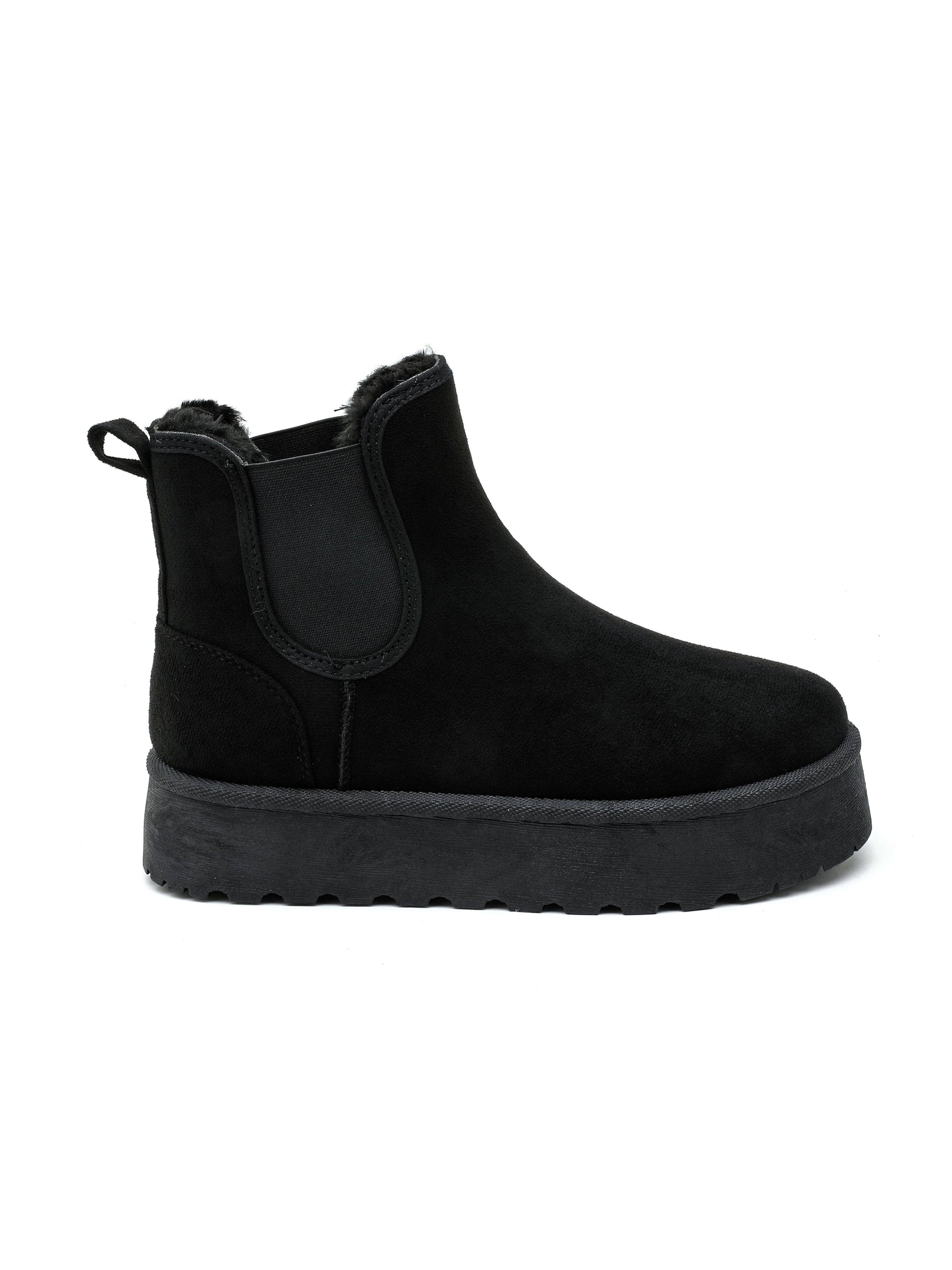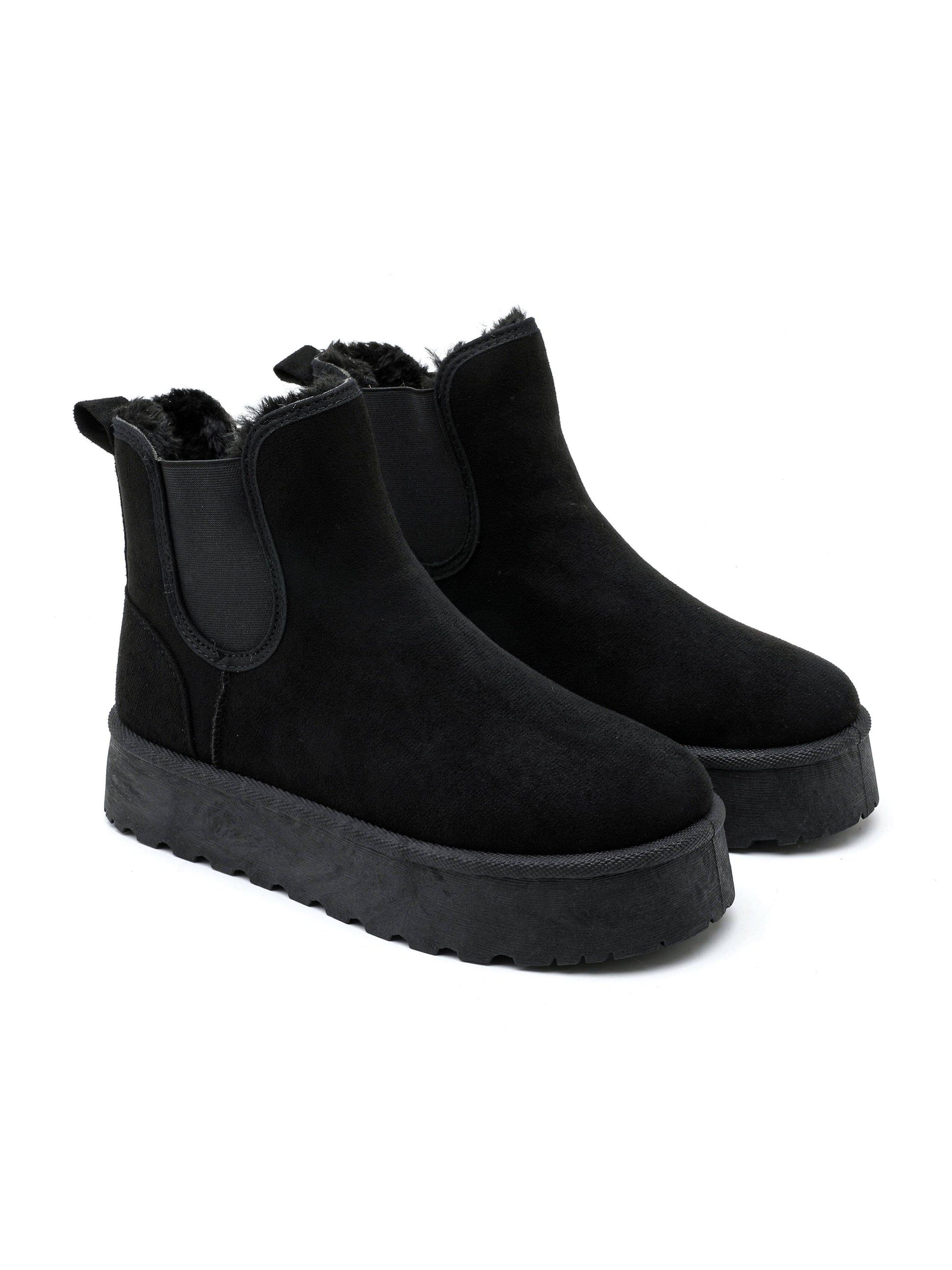 Suede ankle boot, elasticated side inserts, faux fur lining, platform sole.